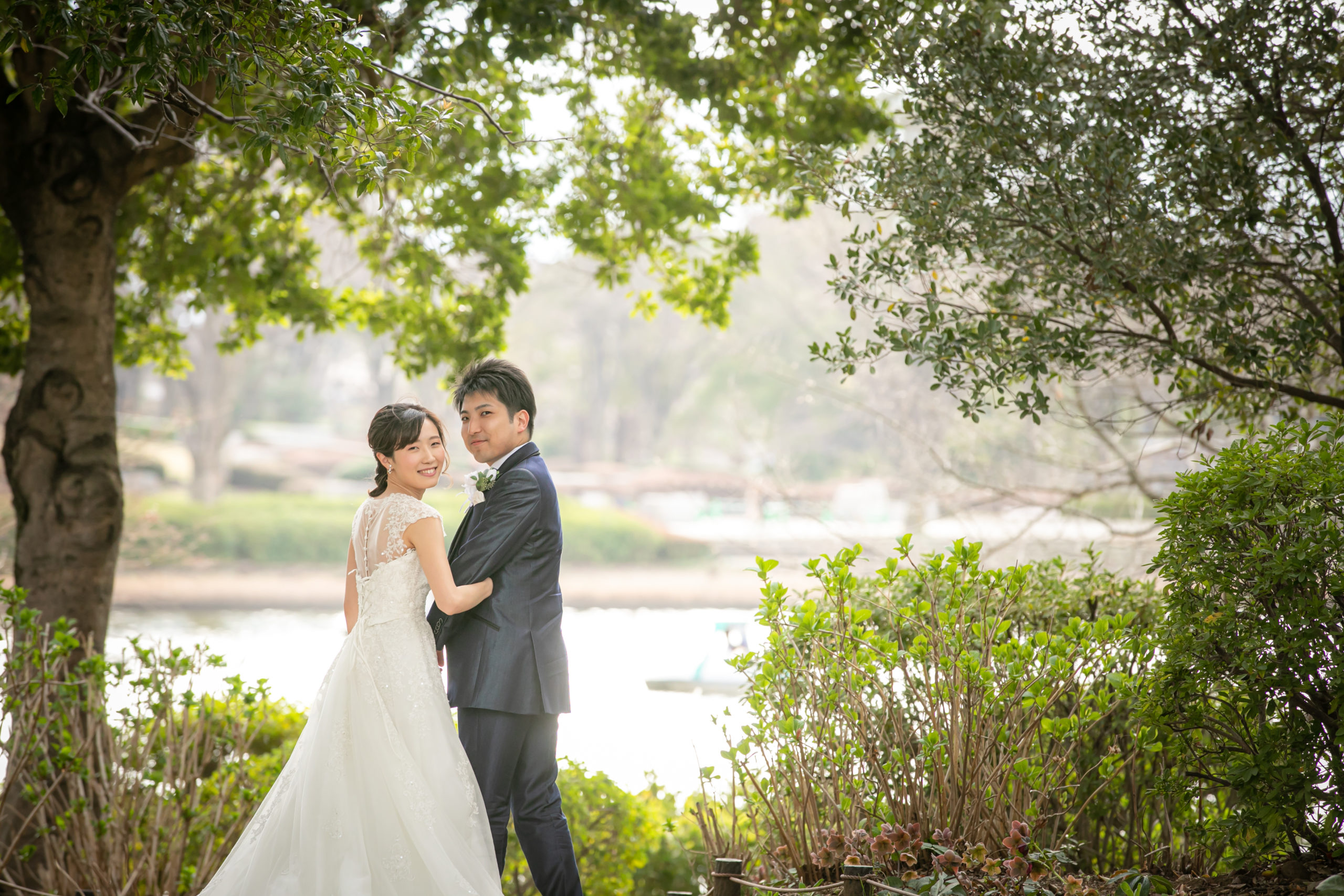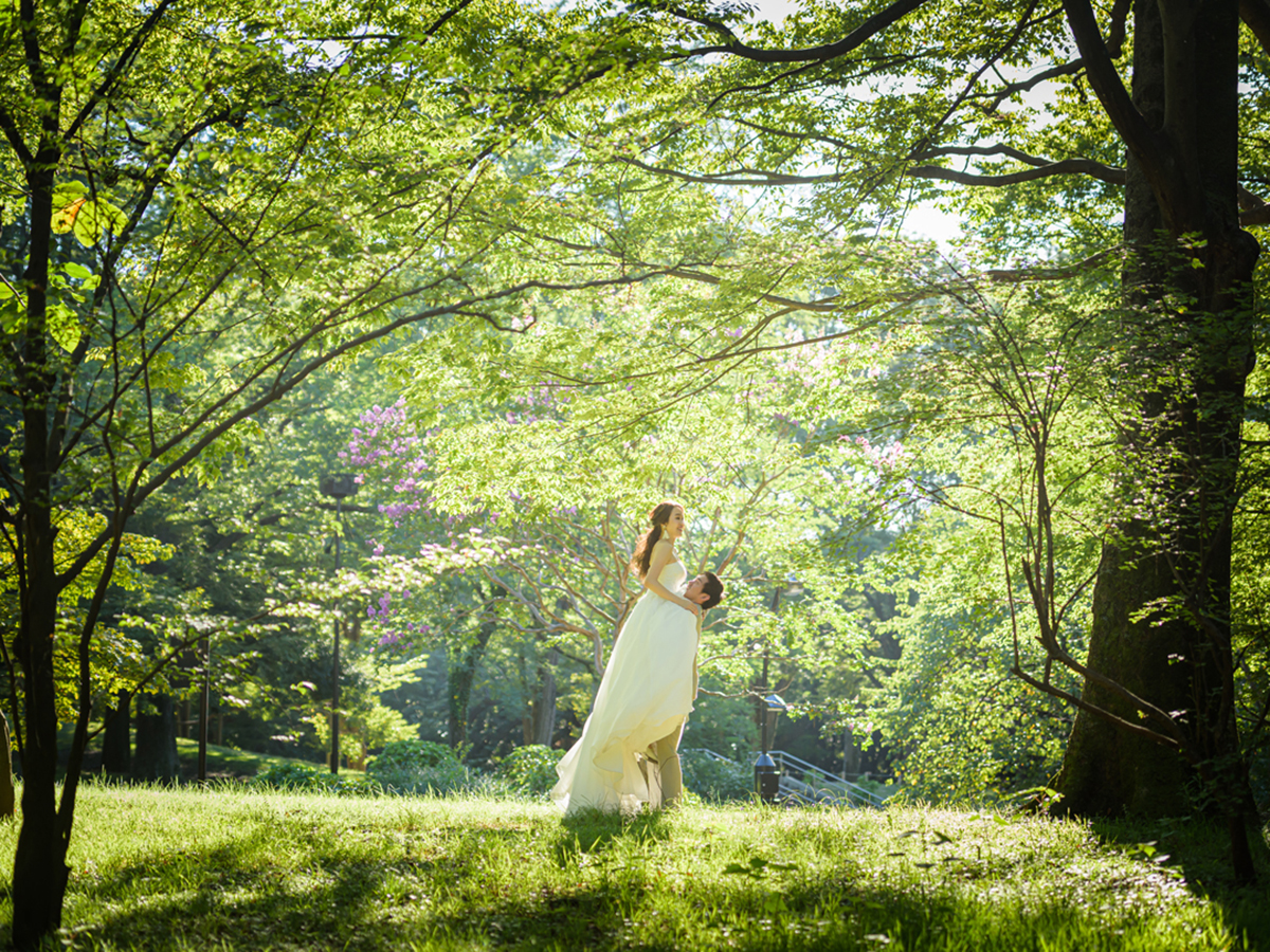 公園や街並みなど、緑や光を活かしたナチュラルフォトが人気。シンプルな背景が洋装の美しさを際立たせます。