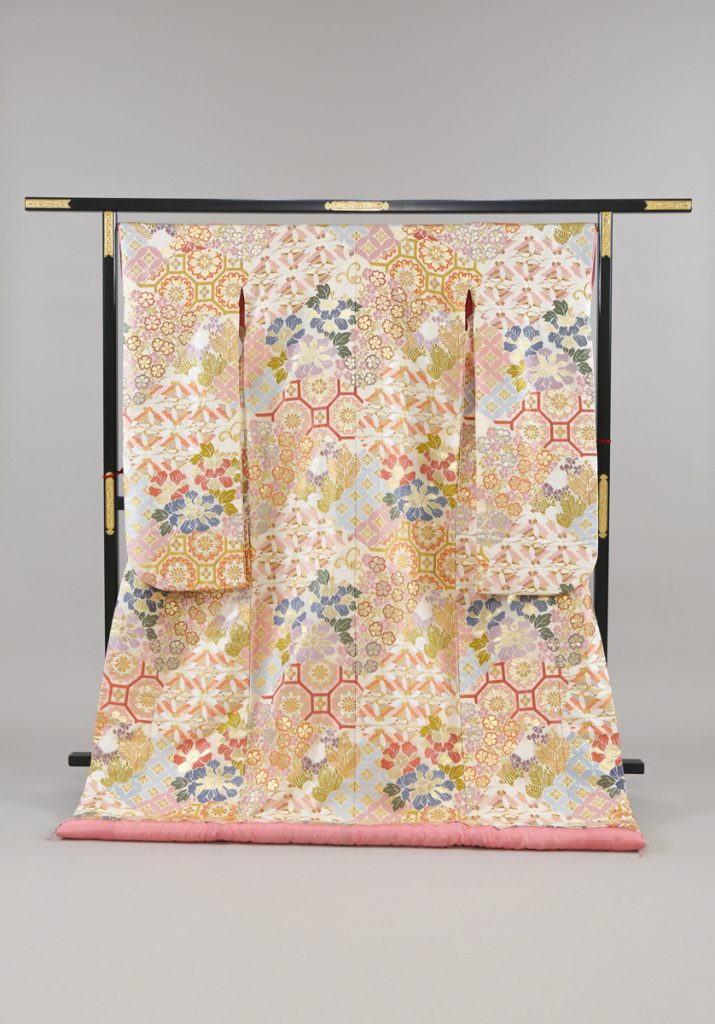 はんなりとした上品なピンク、緑、青が朗らかな雰囲気に、能の衣裳に使われる「唐織」という技法で表現した優美な打掛です!