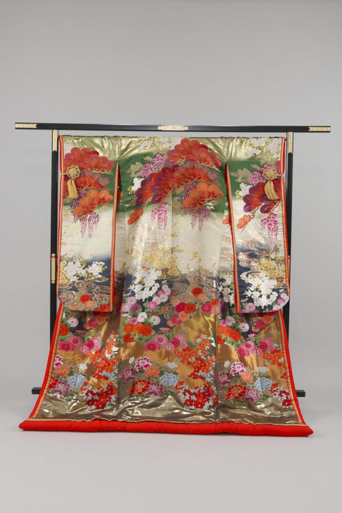 緑と金のぼかしがこの上ない豪華絢爛な気品を漂わせる打掛です。