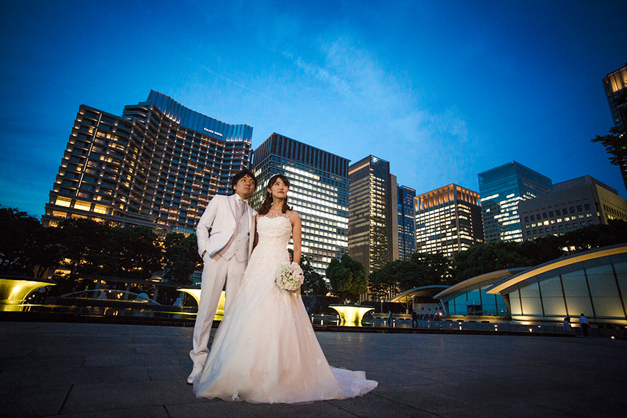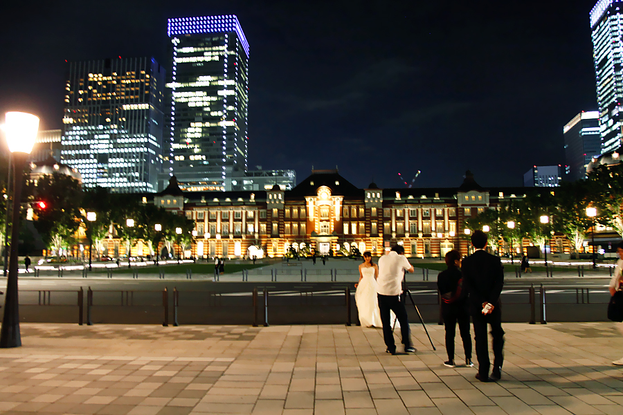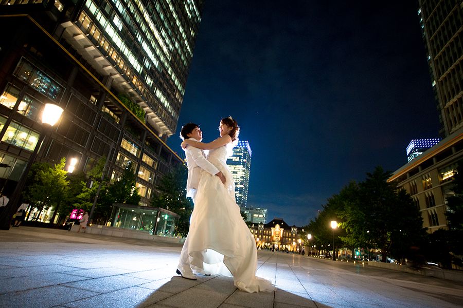 ビル群の灯りが幻想的な雰囲気を創り出してくれる東京駅でのロケーションフォト。