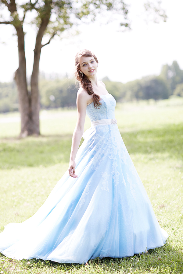 シャンテリーレースをふんだんに使用し水色チュールときらきらの透明スパンチュールを