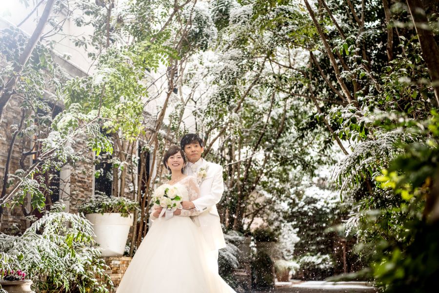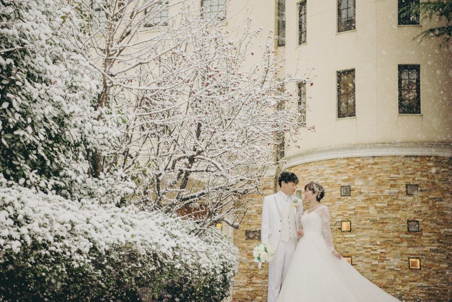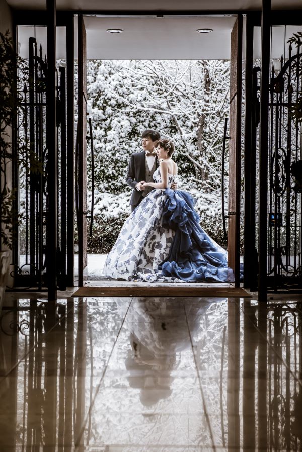 偶然にもおふたりの衣裳の色と雪がリンクして、とてもドラマティックな佇まいです♪