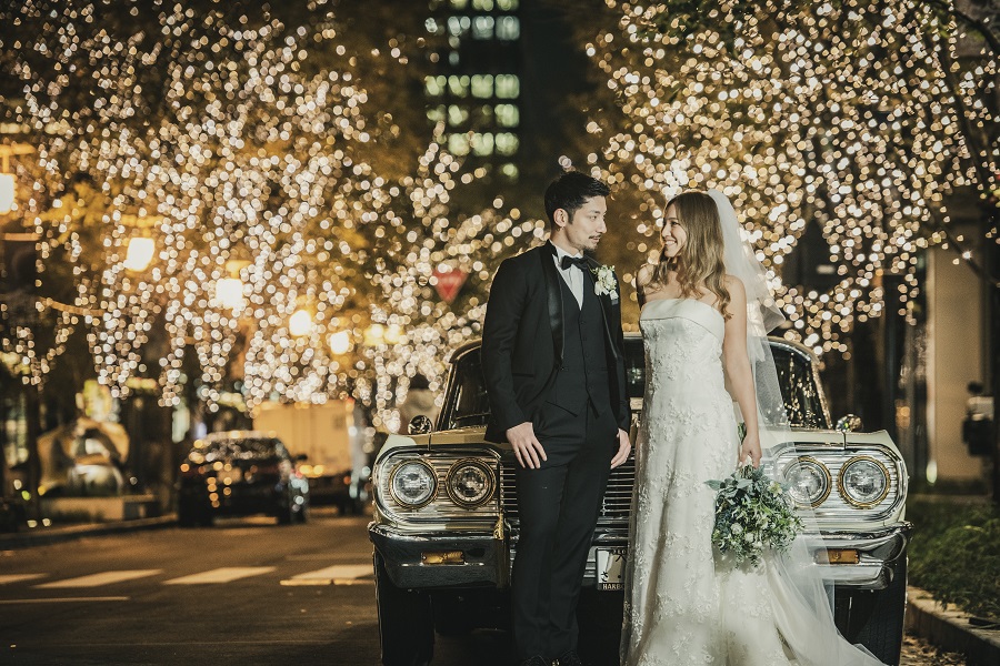 お持ち込みの車を使ってまるで海外にいるようなワンシーン!写真もモノクロに仕上げてかっこよく♡