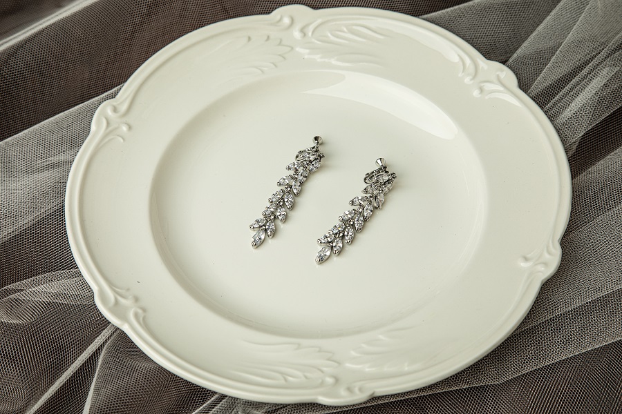 リーフモチーフの煌めきの大きいジルコニアと上品に揺れ動く存在感が美しいイヤリング。