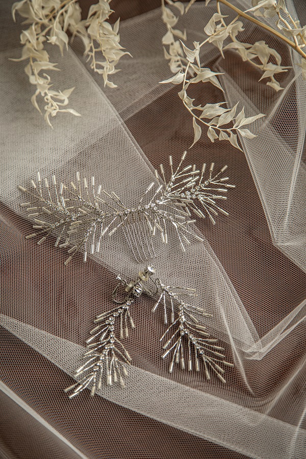 【ヘッドドレス】No.90247 【イヤリング】No.50313 繊細なビーズがキラキラとヘアに映える髪飾りは大人でかっこいい印象になります。 おそろいのイヤリングを合わせて存在感をプラス。