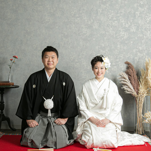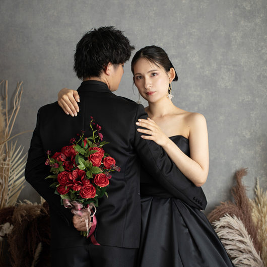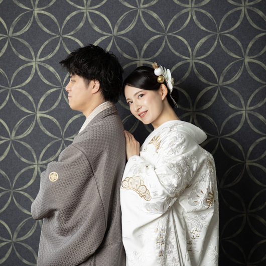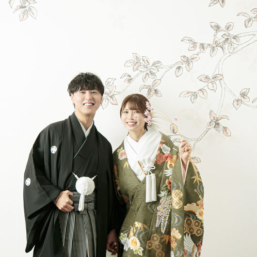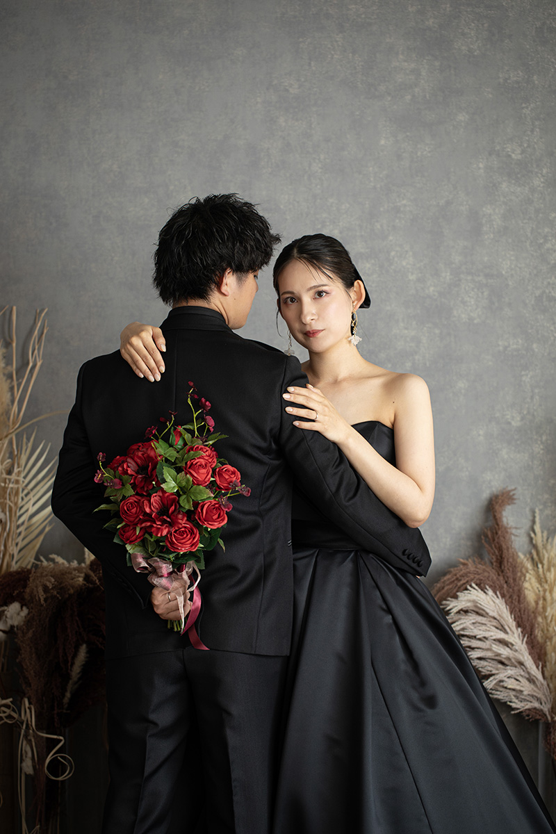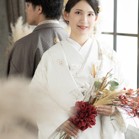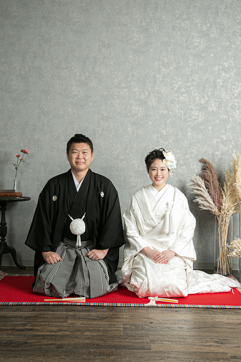 ドレスはもちろん、和装も引き立つ万能な撮影スタイルで、フォーマルな前撮りやポートレート風のカットにもおすすめです。